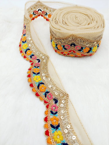 This listing is for 9 Yards Soft Net Lace Trim Floral Embroidery and Sequins, Floral Sari Border, Decorative Trim, Pastel Floral Lace.