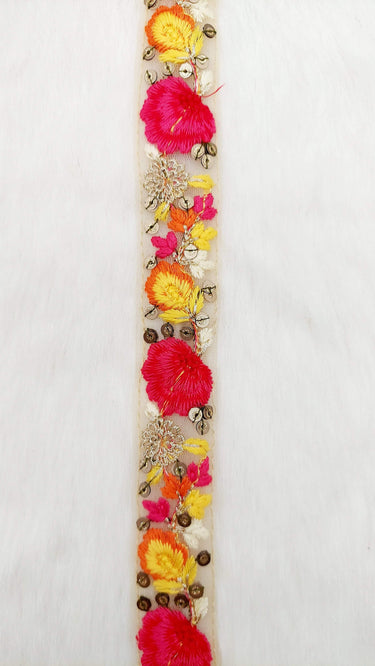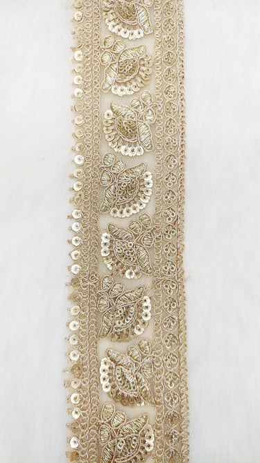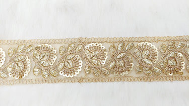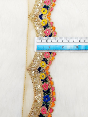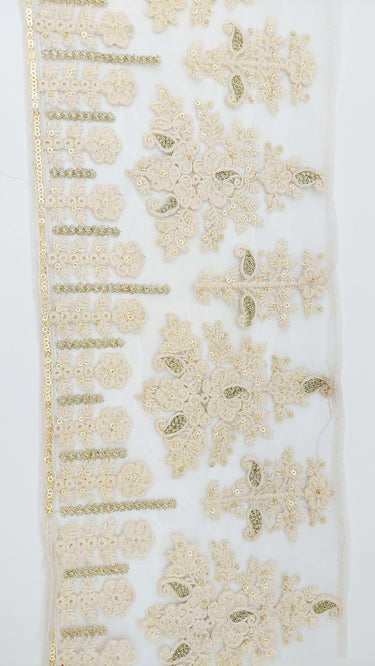 This listing is for 9 Yards Off White Net Lace Trim Floral Embroidery and Gold Sequins, Floral Sari Border, Decorative Trim.