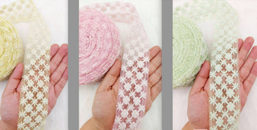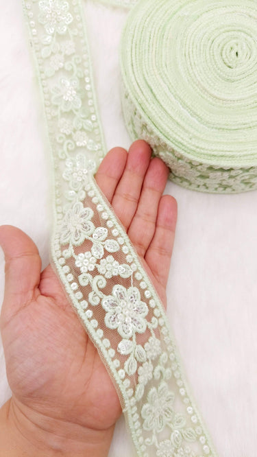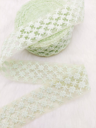 This listing is for 9 Yards Soft Net Lace Floral Embroidery and Sequins, Sari Border, Decorative Trim, Pastel Floral Lace, Available in Green, Yellow & Pink.