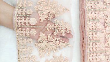 This listing is for 9 Yards Peach Net Lace Trim Floral Embroidery and Gold Sequins, Floral Sari Border, Decorative Trim.