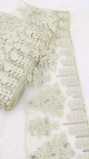 This listing is for 9 Yards Green Net Lace Trim Floral Embroidery and Gold Sequins, Floral Sari Border, Decorative Trim.