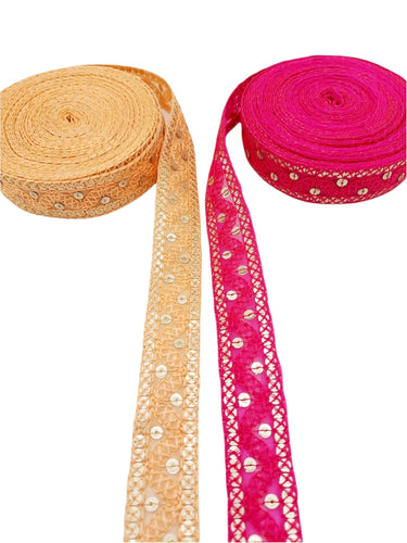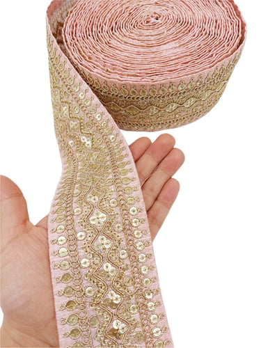 This listing is for a stunning Pink Tissue Embroidered Trim, Gold Sequins Trim Decorative Lace Sari Border Costume Ribbon Crafting Sewing Tape.