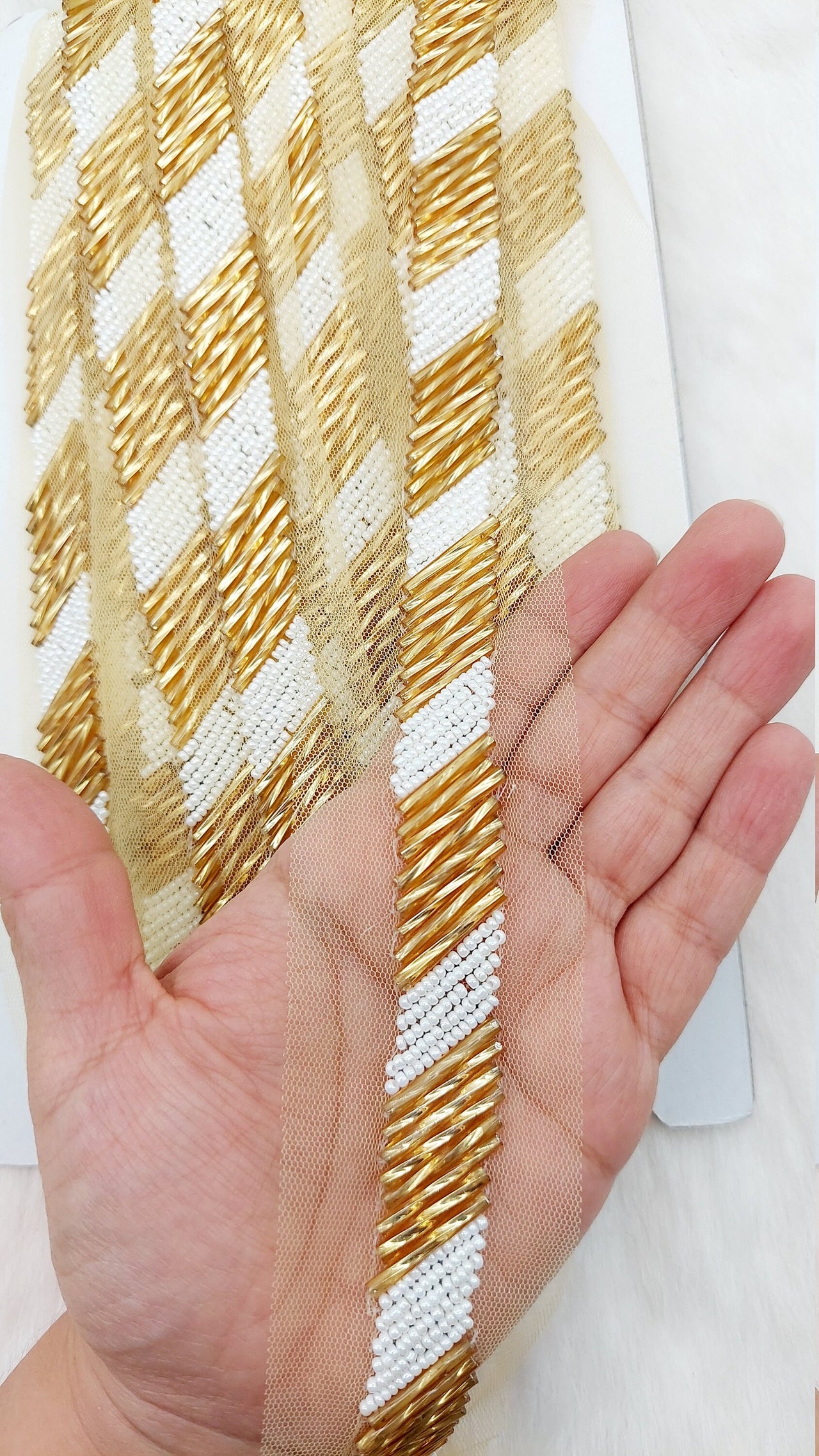 Beige Net Bridal Trim In Gold And White Beaded Embroidery, Hand Embroidered Bead Lace, Embroidered Lace