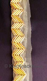 Beige Net Fabric Lace Trim With Gold Bugle Tube Beads And Gold Zardozi Embroidery, Beaded Trim, Approx. 24mm Wide