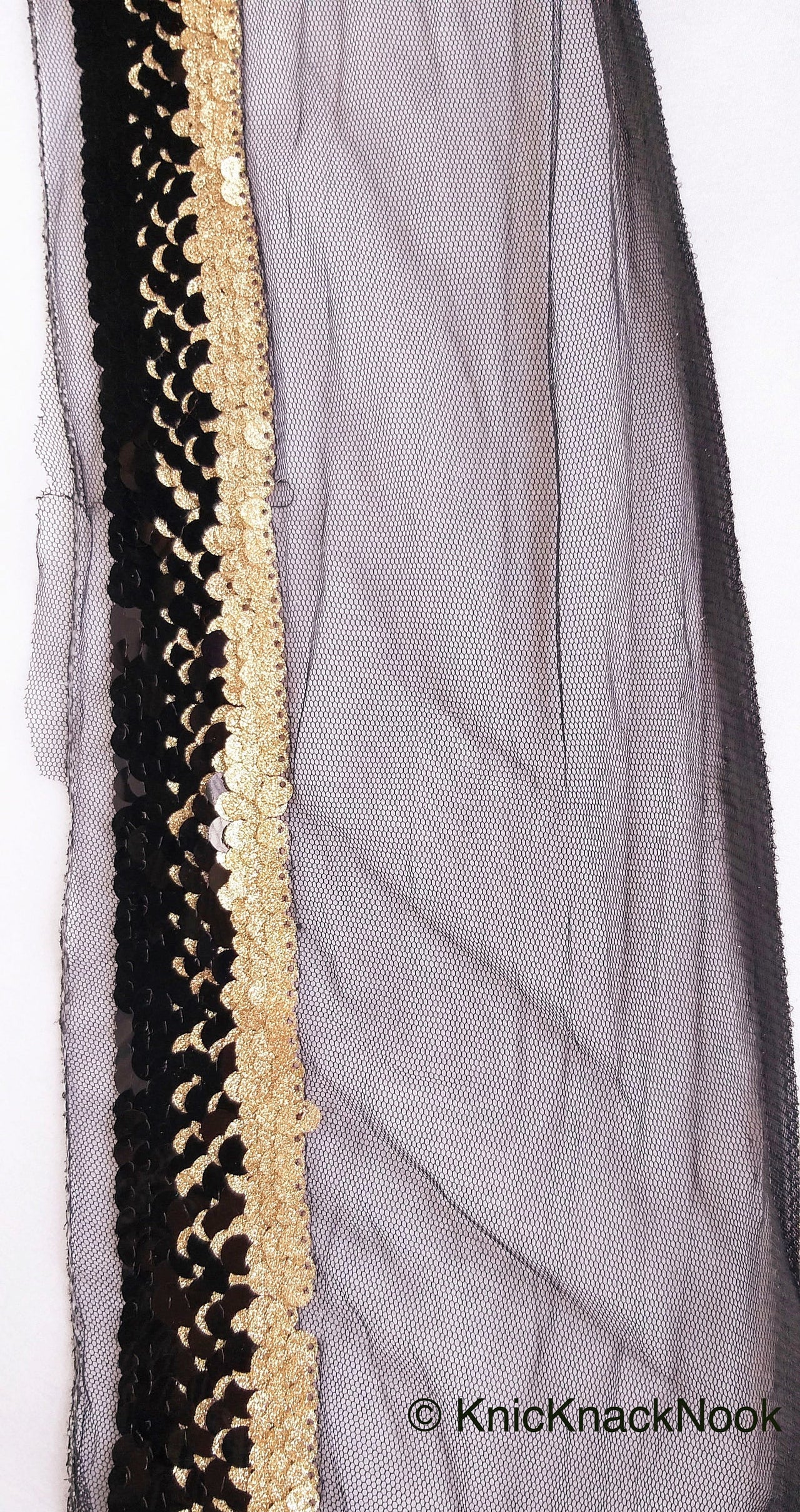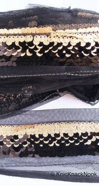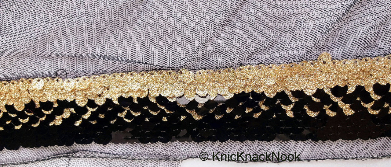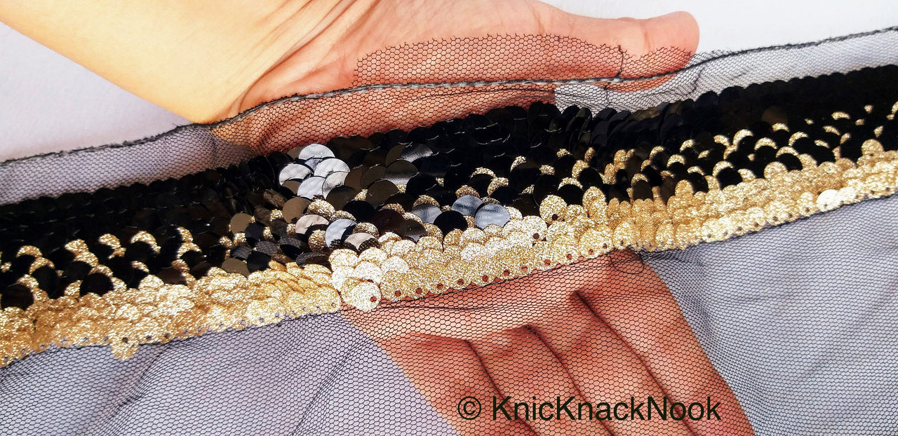 Black Net Lace With Glossy Black And Glitter Gold Sequins, Black Trim, Approx. 16cm wide