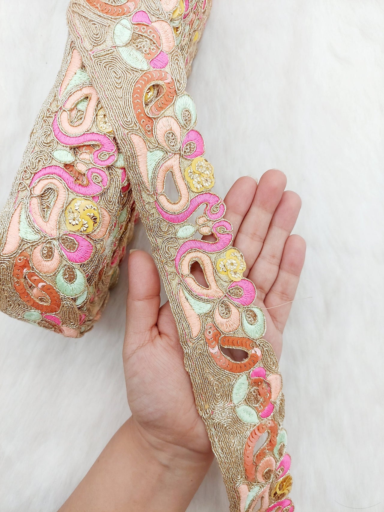 The embroidery on this trim is called Zardozi, an exclusive type of embroidery that is done by hand. Zardozi comes from two Persian words: zar or zarin meaning 'gold', and dozi meaning 'sewing'. Zardozi is a type of heavy and elaborate metal embroidery on a silk, satin, or velvet fabric base.