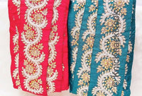 The embroidery on this trim is called Zardozi, an exclusive type of embroidery that is done by hand. Zardozi comes from two Persian words: zar or zarin meaning 'gold', and dozi meaning 'sewing'. Zardozi is a type of heavy and elaborate metal embroidery on a silk, satin, or velvet fabric base.