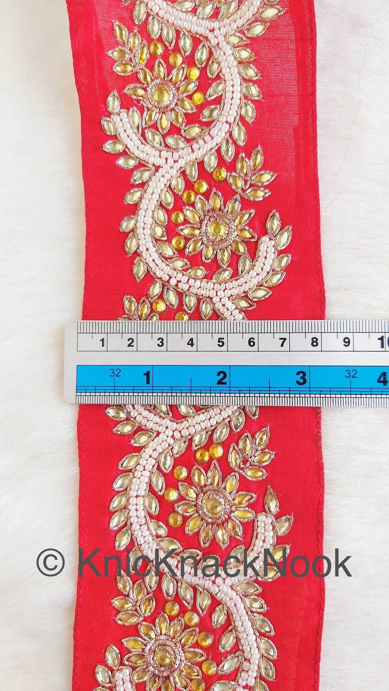 Red Silk Lace Trim With Floral Zardozi Hand Embroidery And White Beads & Indian Stones Kundan Embellishment, Approx. 80mm, Decorative Trim