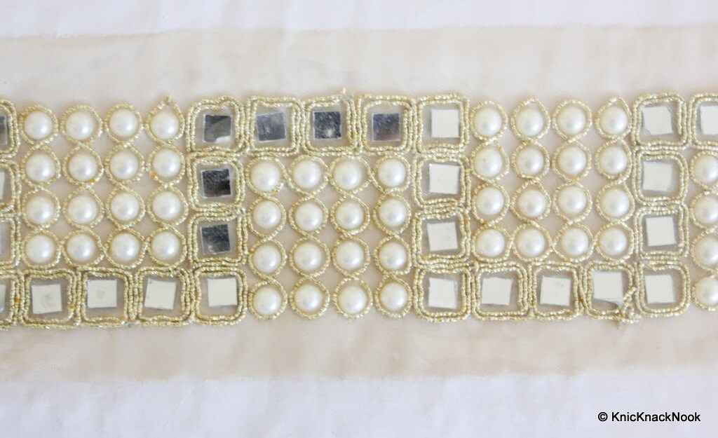 Sheer Gold Fabric Lace Trim With Mirror And Pearl Embellishments, Approx. 64mm Wide Indian Crafting Ribbon Decorative Trimming