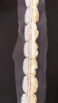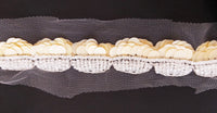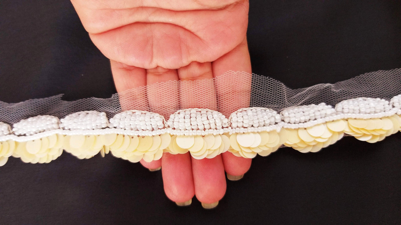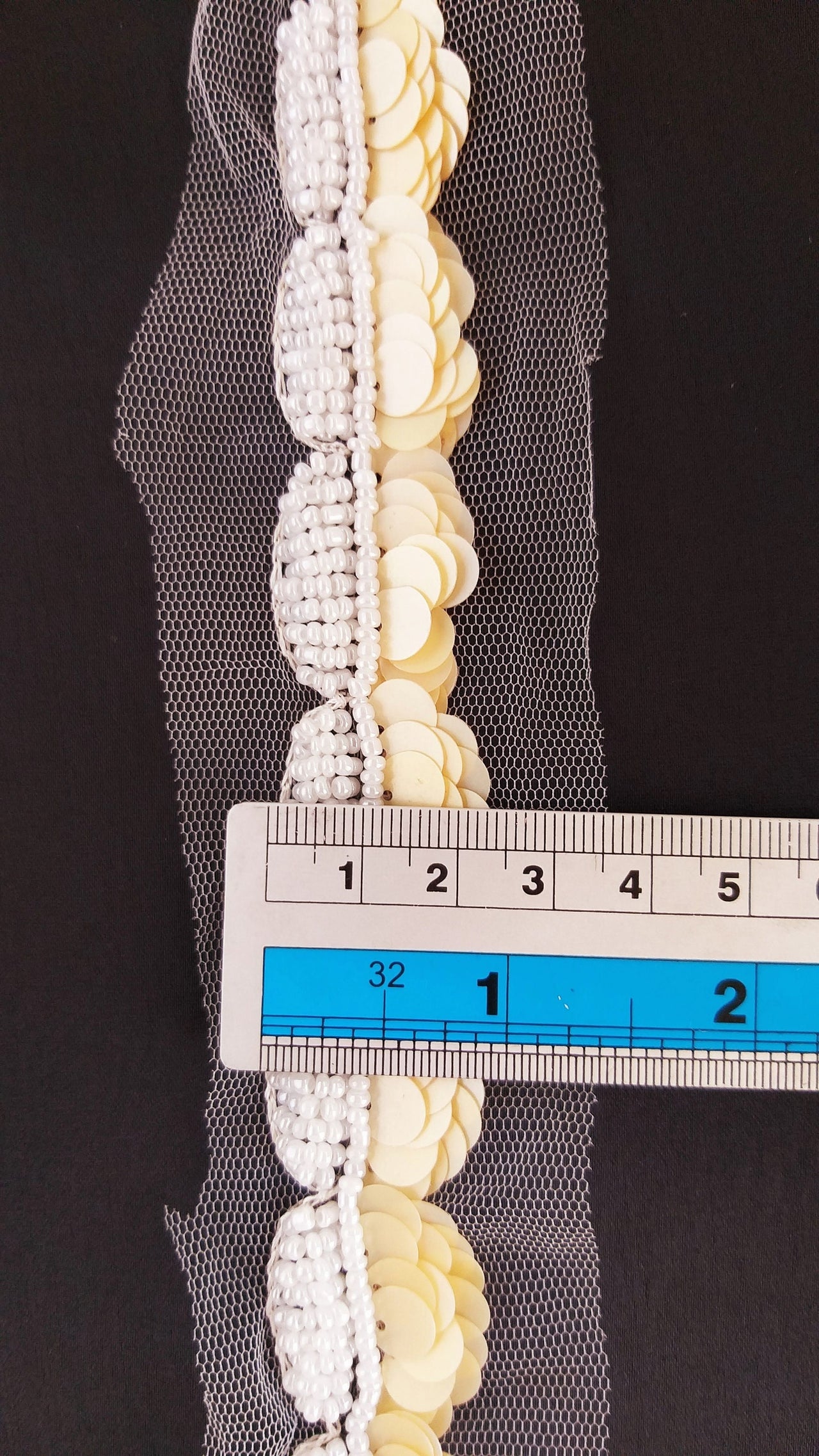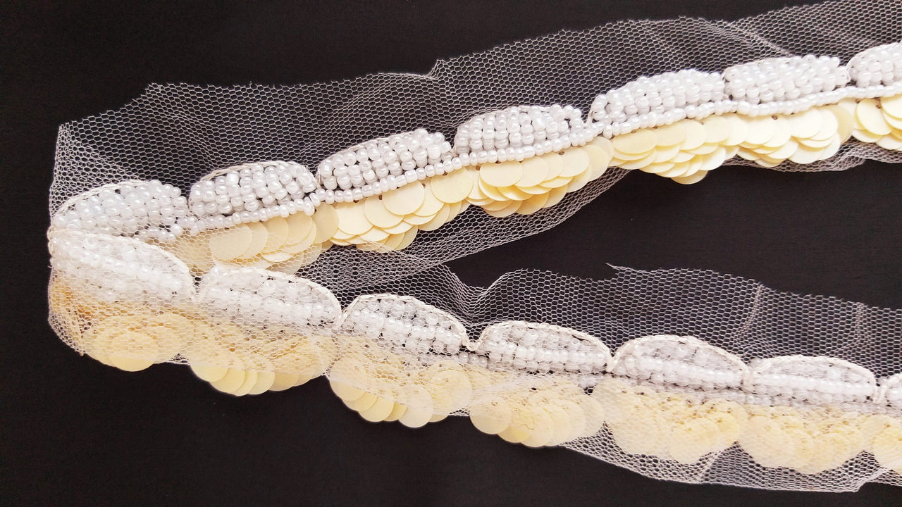 White Net Lace With Beige Sequins and Off White Beads, Scallop Trim, Exclusive Laces