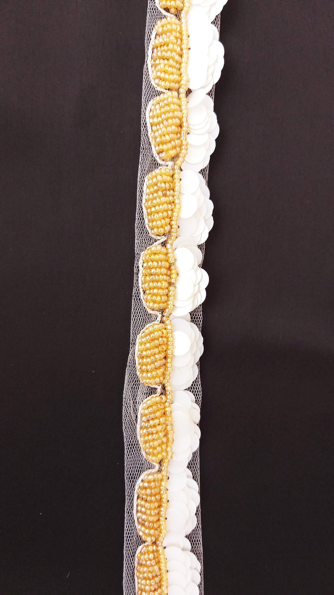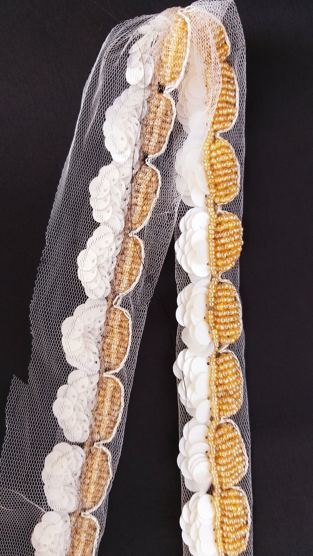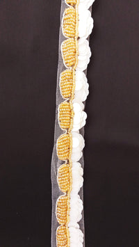 White Net Lace With Off White Sequins and Gold Beads, Scallop Trim, Exclusive Laces