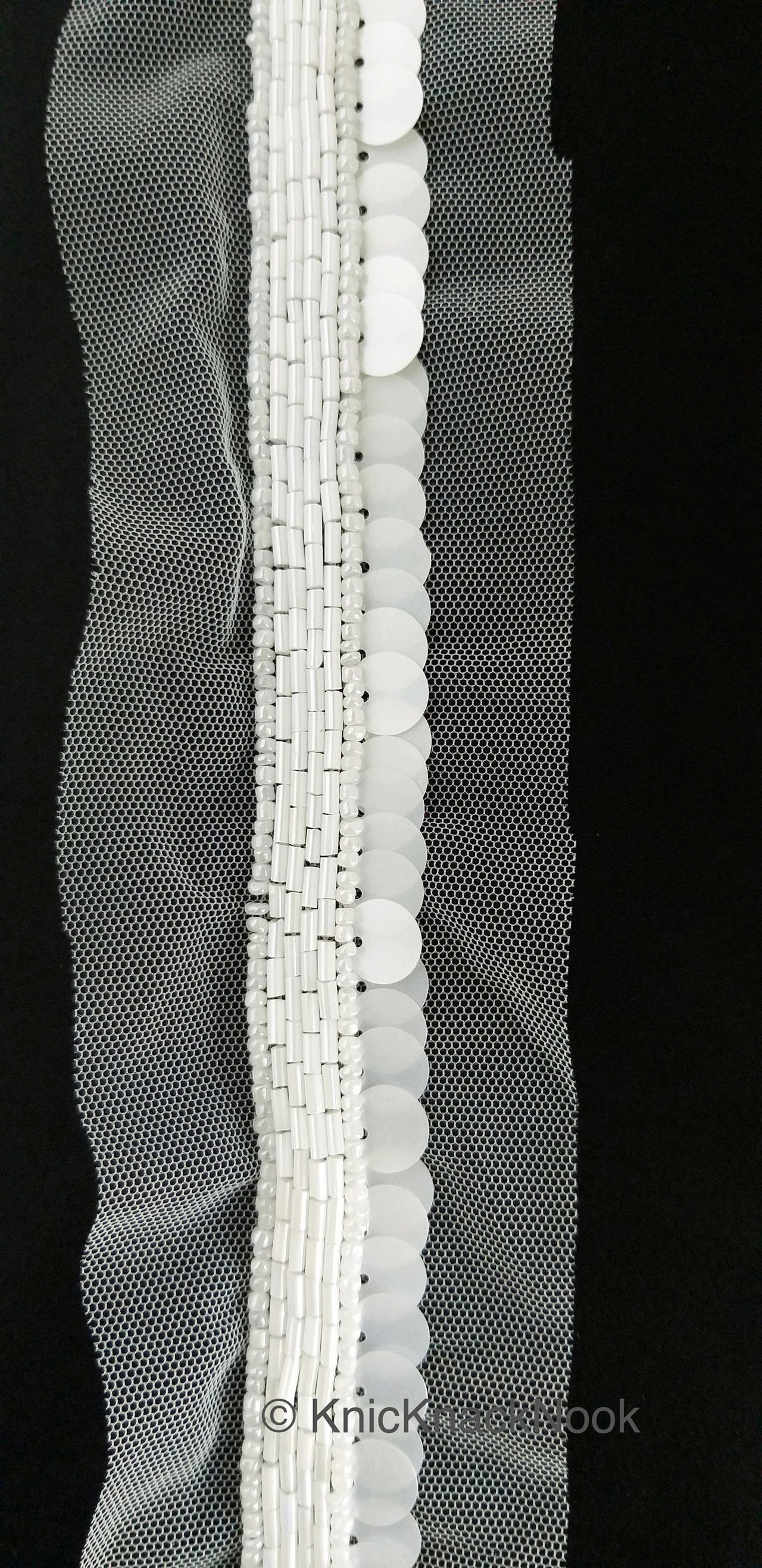 White Net Lace With White Sequins and Beads, Exclusive Laces, Sequinned Trimming