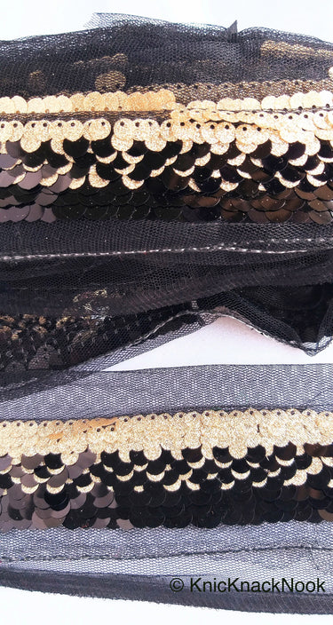 This listing is for a lovely Black Net Lace With Glossy Black And Glitter Gold Sequins, Black Trim.