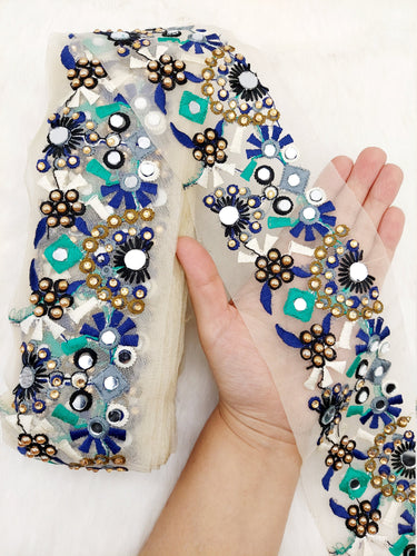This listing is for a stunning Floral Embroidered Fabric Trim In Gold, Black, Pink and Blue Embroidery With Pearl Beads and Rhinestones Embellishments, Saree Border, Belt. This is a very unique trim and would make any creation stand out.