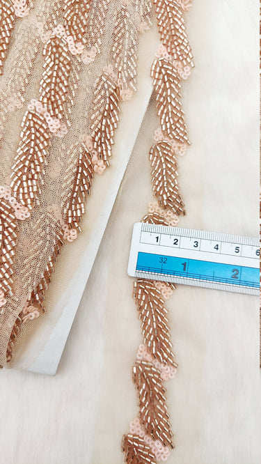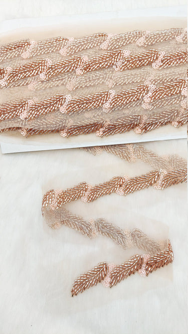 This listing is for a stunning Beige Net Bridal Trim In Rose Gold Beaded Leaf Embroidery, Hand Embroidered Bead Lace, Floral Embroidered Trim, Trim By 9 Yards. This is a very unique trim and would make any creation stand out.