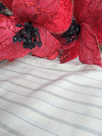 The embroidery on this trim is called Zardozi, an exclusive type of embroidery that is done by hand. Zardozi comes from two Persian words: zar or zarin meaning 'gold', and dozi meaning 'sewing'. Zardozi is a type of heavy and elaborate metal embroidery on a silk, satin, or velvet fabric base.