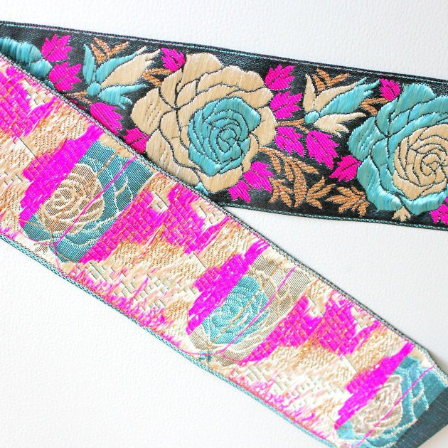 This listing is for a lovely Black Fabric Lace With Rose Floral Design, Pink, Blue, Gold And Beige Thread Work Trim.