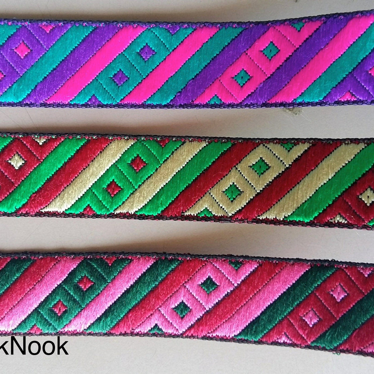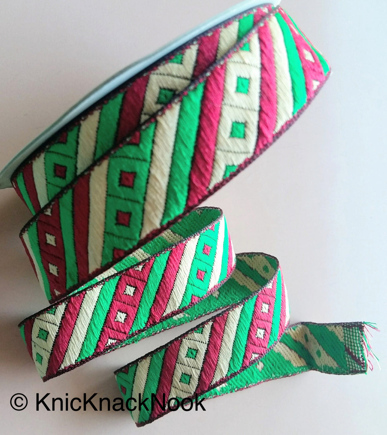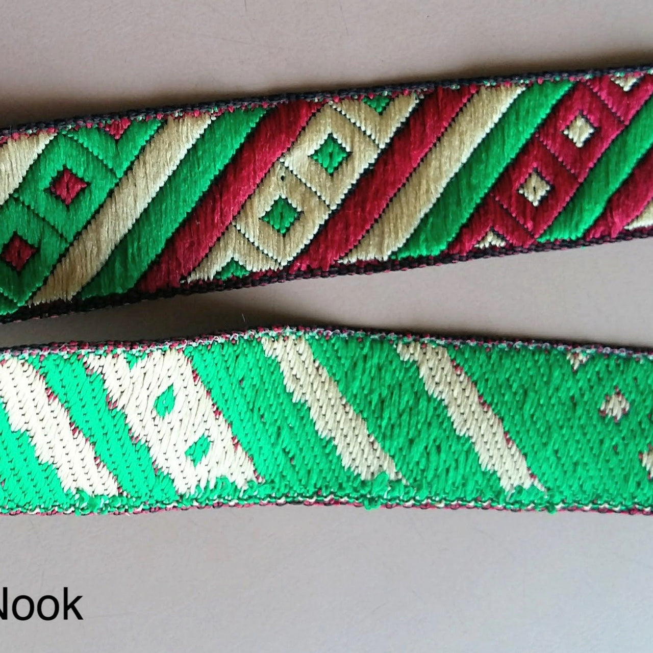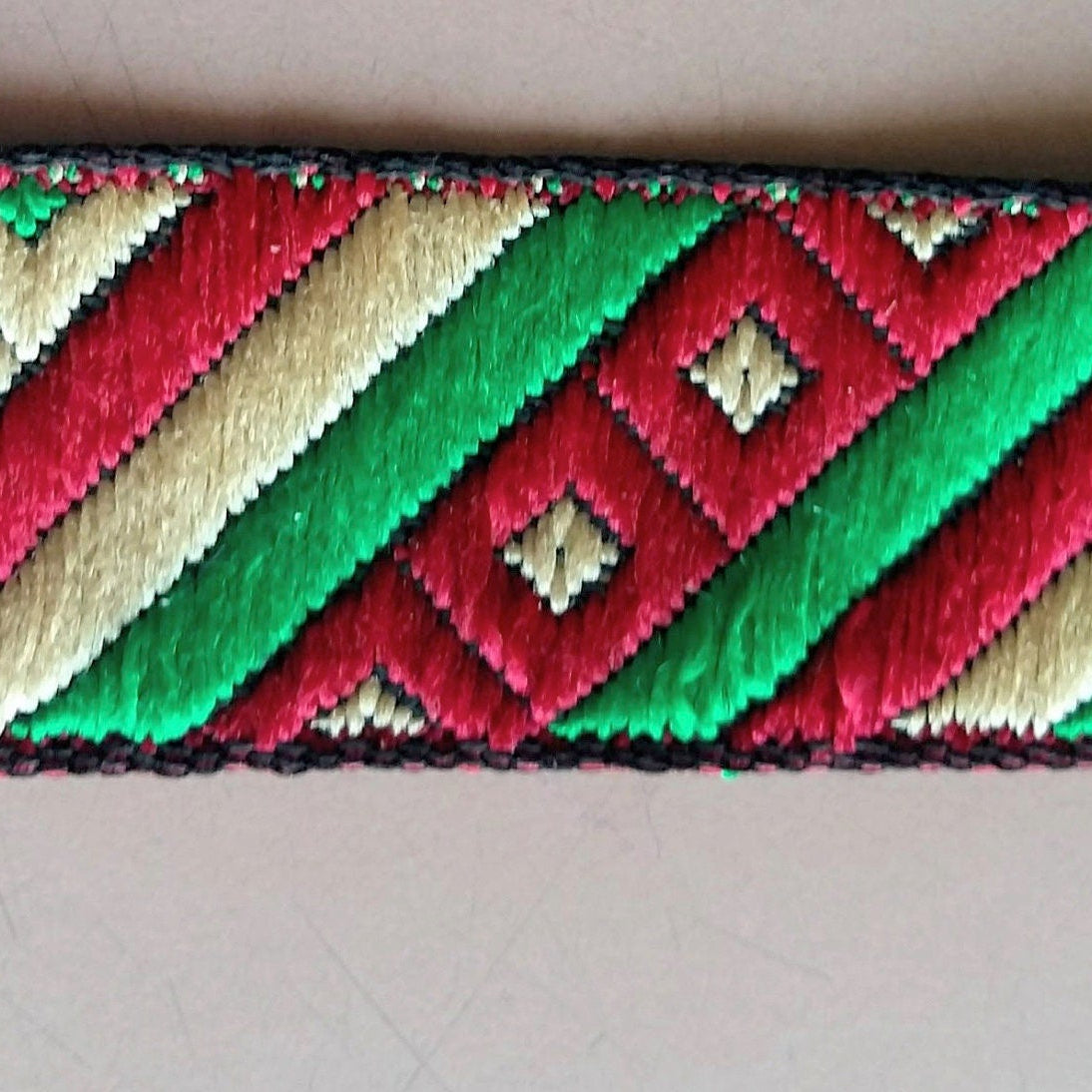 Maroon Red, Green And Beige Stripes and Square Geometric Pattern Embroidered Trim, Approx. 20mm Wide - 200317L395