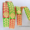The embroidery on this trim is called Zardozi, an exclusive type of embroidery that is done by hand. Zardozi comes from two Persian words: zar or zarin meaning 'gold', and dozi meaning 'sewing'. Zardozi is a type of heavy and elaborate metal embroidery on a silk, satin, or velvet fabric base.