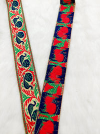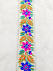 The embroidery on this trim is called Zardozi, an exclusive type of embroidery that is done by hand. Zardozi comes from two Persian words: zar or zarin meaning 'gold', and dozi meaning 'sewing'. Zardozi is a type of heavy and elaborate metal embroidery on a silk, satin, or velvet fabric base.
