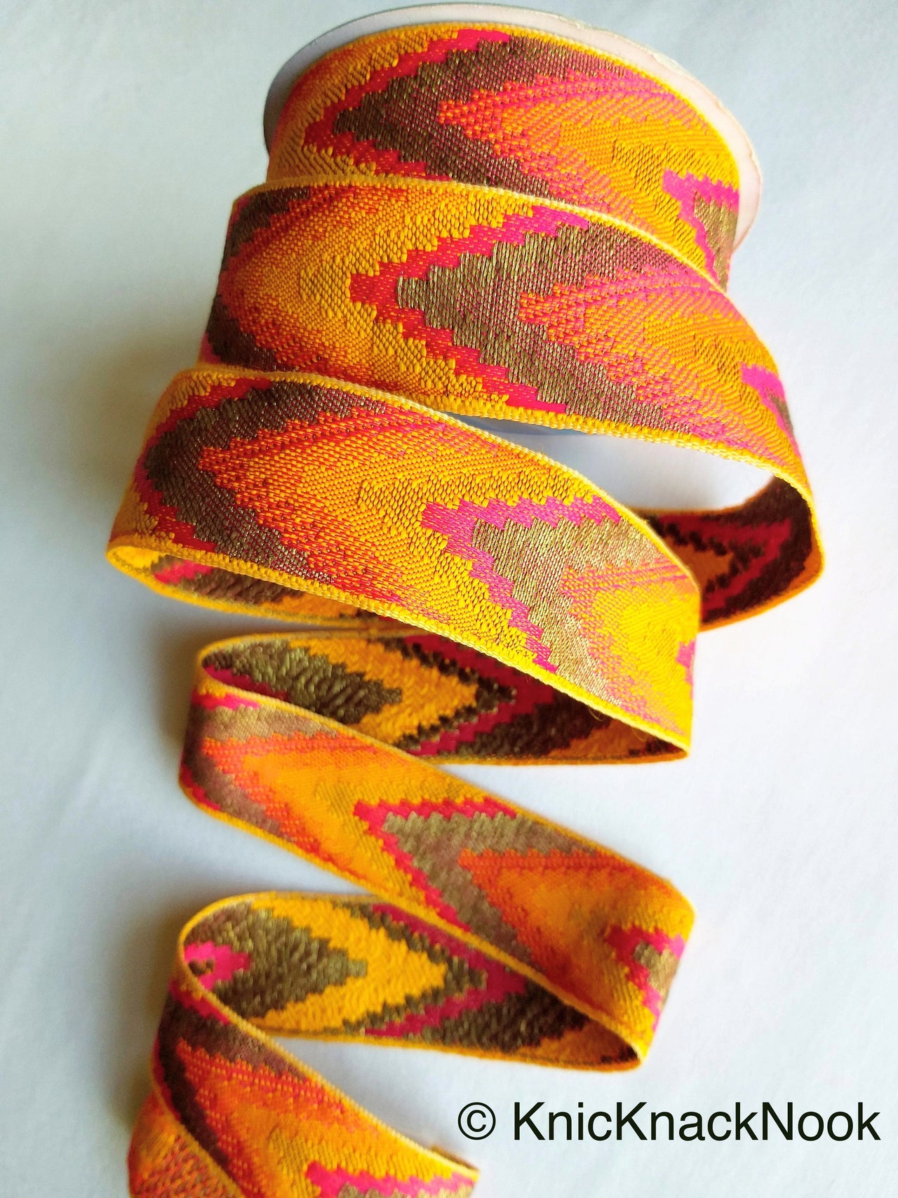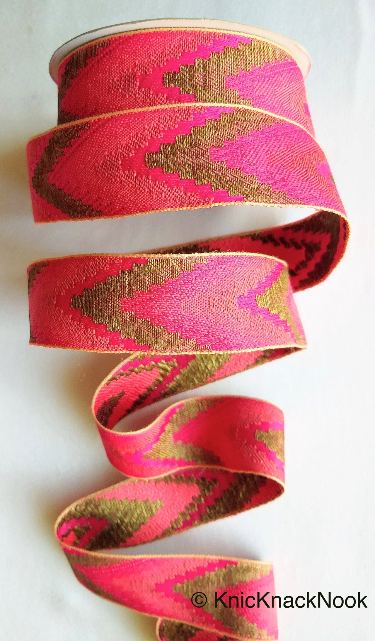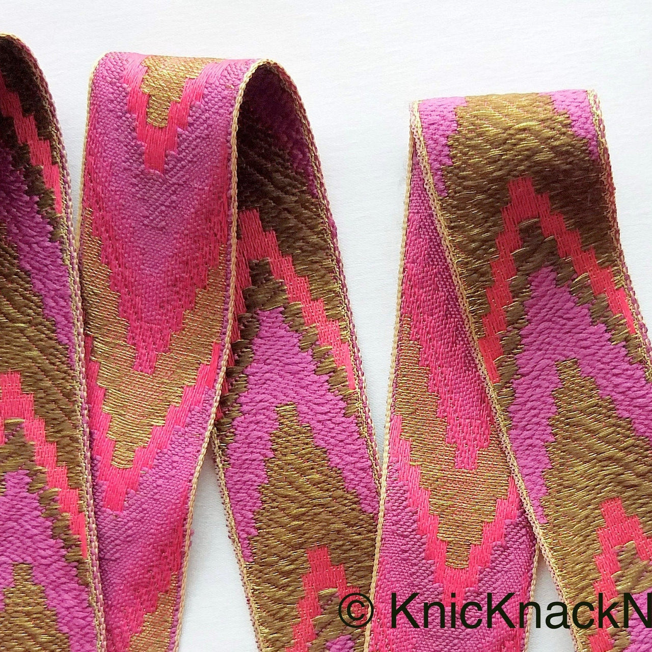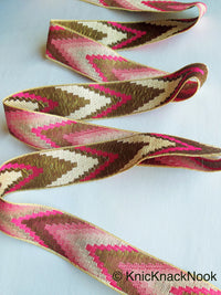 Purple / Green / Pink / Yellow / Beige, Pink And Antique Bronze Embroidered Lace Trim, Chevron Trim