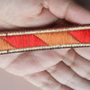 The embroidery on this trim is called Zardozi, an exclusive type of embroidery that is done by hand. Zardozi comes from two Persian words: zar or zarin meaning 'gold', and dozi meaning 'sewing'. Zardozi is a type of heavy and elaborate metal embroidery on a silk, satin, or velvet fabric base.