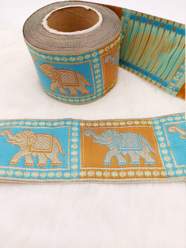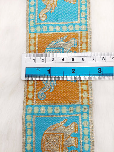 This listing is for a lovely Beige Shimmer Jacquard Brocade Saree Border Trim with Elephant Woven in Brown and Blue, 9 Yards.