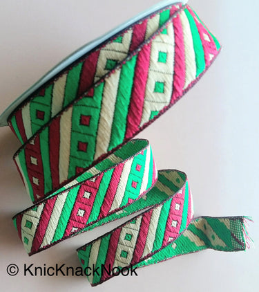 This listing is for a lovely Maroon Red, Green And Beige Stripes and Square Geometric Pattern Embroidered Trim.