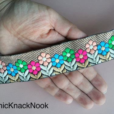 This listing is for a lovely Blue, Green, Fuchsia Pink, Orange, Beige and Bronze Thread Floral Embroidery Trim.