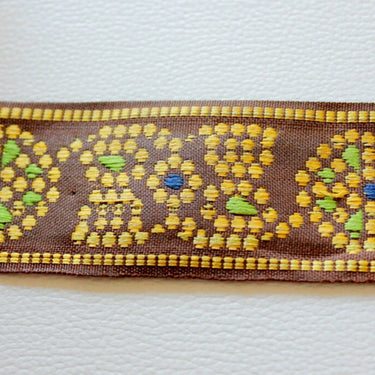 This listing is for a lovely Brown Cotton Lace Trim With Green and Yellow Floral Embroidery.