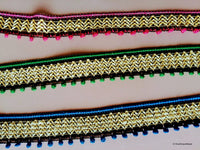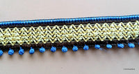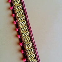 The embroidery on this trim is called Zardozi, an exclusive type of embroidery that is done by hand. Zardozi comes from two Persian words: zar or zarin meaning 'gold', and dozi meaning 'sewing'. Zardozi is a type of heavy and elaborate metal embroidery on a silk, satin, or velvet fabric base.