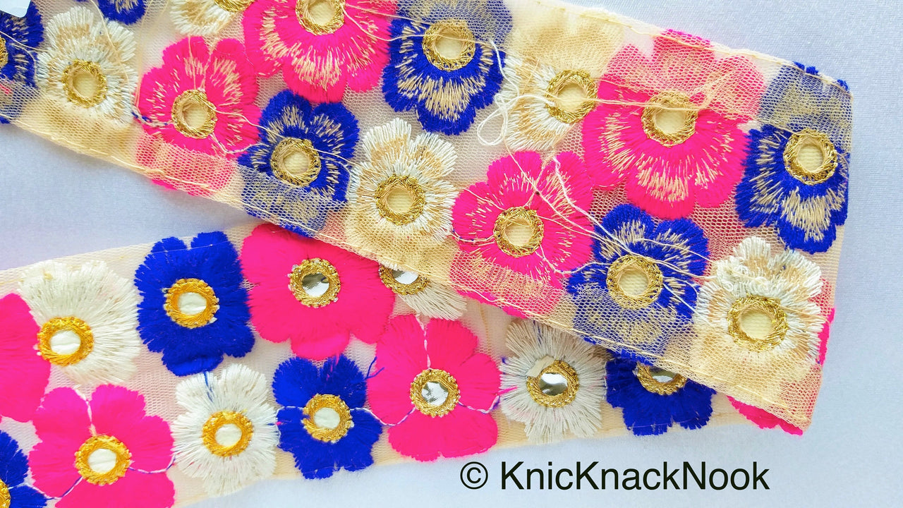 Beige Net Lace Trim In Blue, Off White, Fuchsia Pink And Gold Floral Embroidery And Mirror Embellishments
