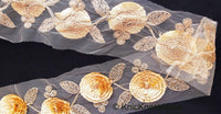 The embroidery on this trim is called Zardozi, an exclusive type of embroidery that is done by hand. Zardozi comes from two Persian words: zar or zarin meaning 'gold', and dozi meaning 'sewing'. Zardozi is a type of heavy and elaborate metal embroidery on a silk, satin, or velvet fabric base.