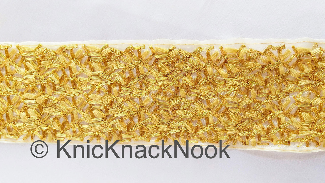 Beige Sheer Tissue Fabric Trim With Cotton Thread Embroidery In Light Green And Antique Gold, Fabric Lace, Embroidered Trim