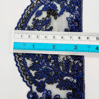 Black Net Scallop Lace Trim with Navy Blue Floral Embroidery With Sequins, Sari Border, Embroidered Trim