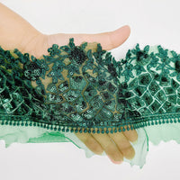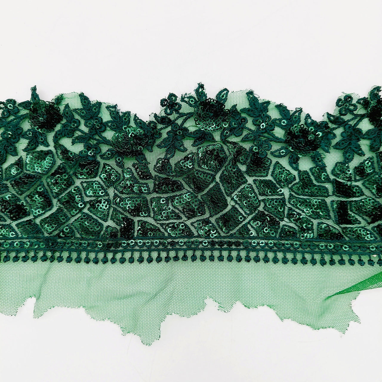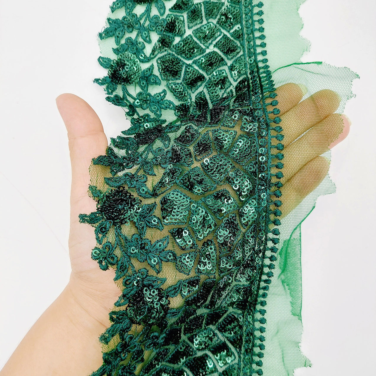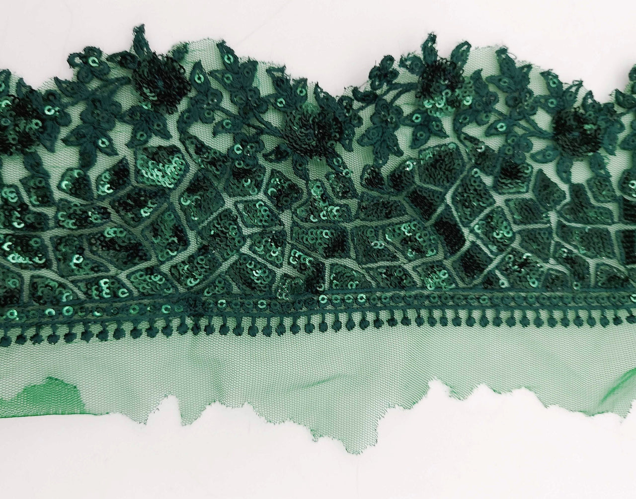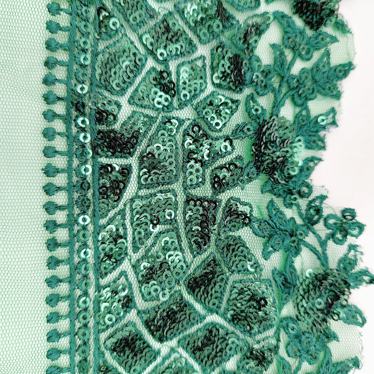 Green Net Lace Trim with Floral Embroidery And Sequins, Sari Border, Embroidered Trim
