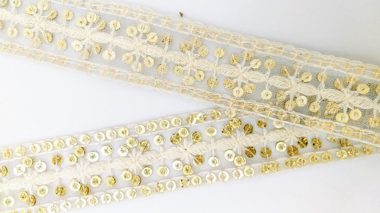 Nine Yards White Net Lace Trim Floral Embroidered With Gold Sequins, Sequinned Trim, Wedding Trim Bridal Trim