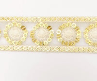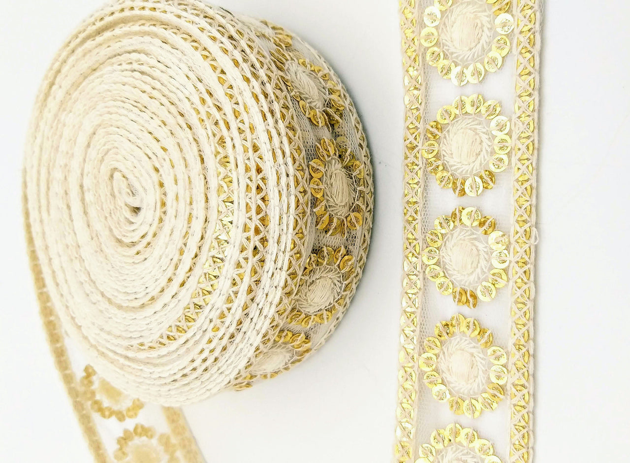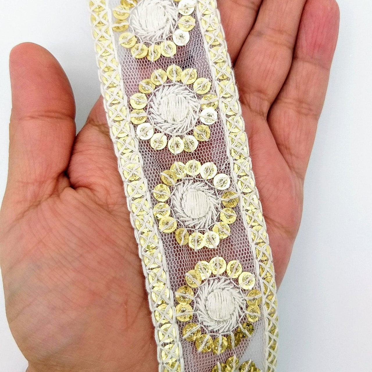 Nine Yards White Net Lace Trim Floral Embroidered With Gold Sequins, Sequinned Trim, Wedding Trim Bridal Trim