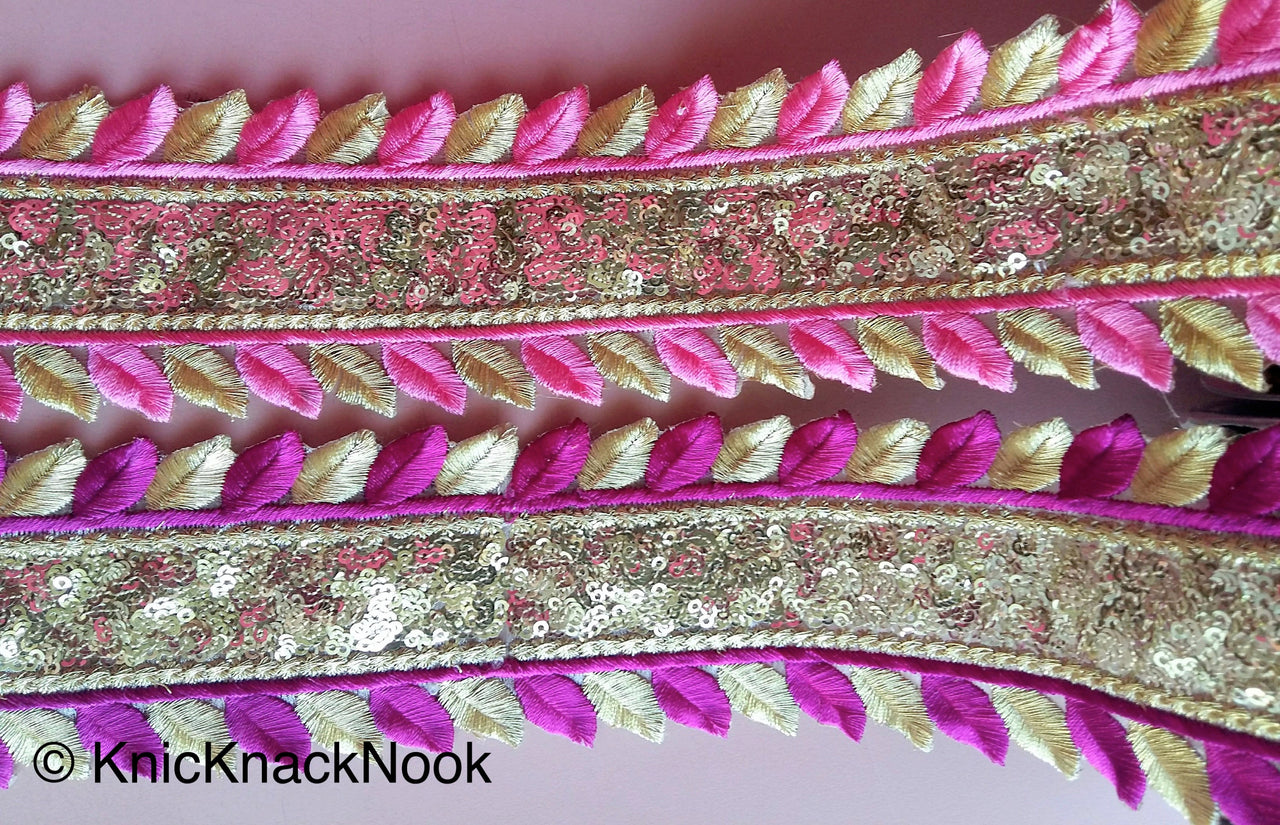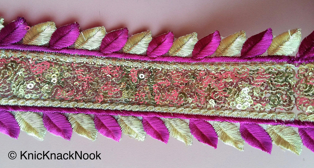 Purple And Gold Silk Thread Embroidery With Gold Sequins, One Yard Lace Silk Trim, Approx. 64mm Wide