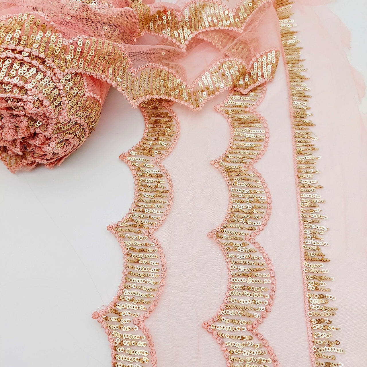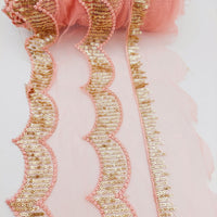 Salmon Pink Net Scallop Lace Trim with Gold Sequins, Sari Border, Embroidered Trim