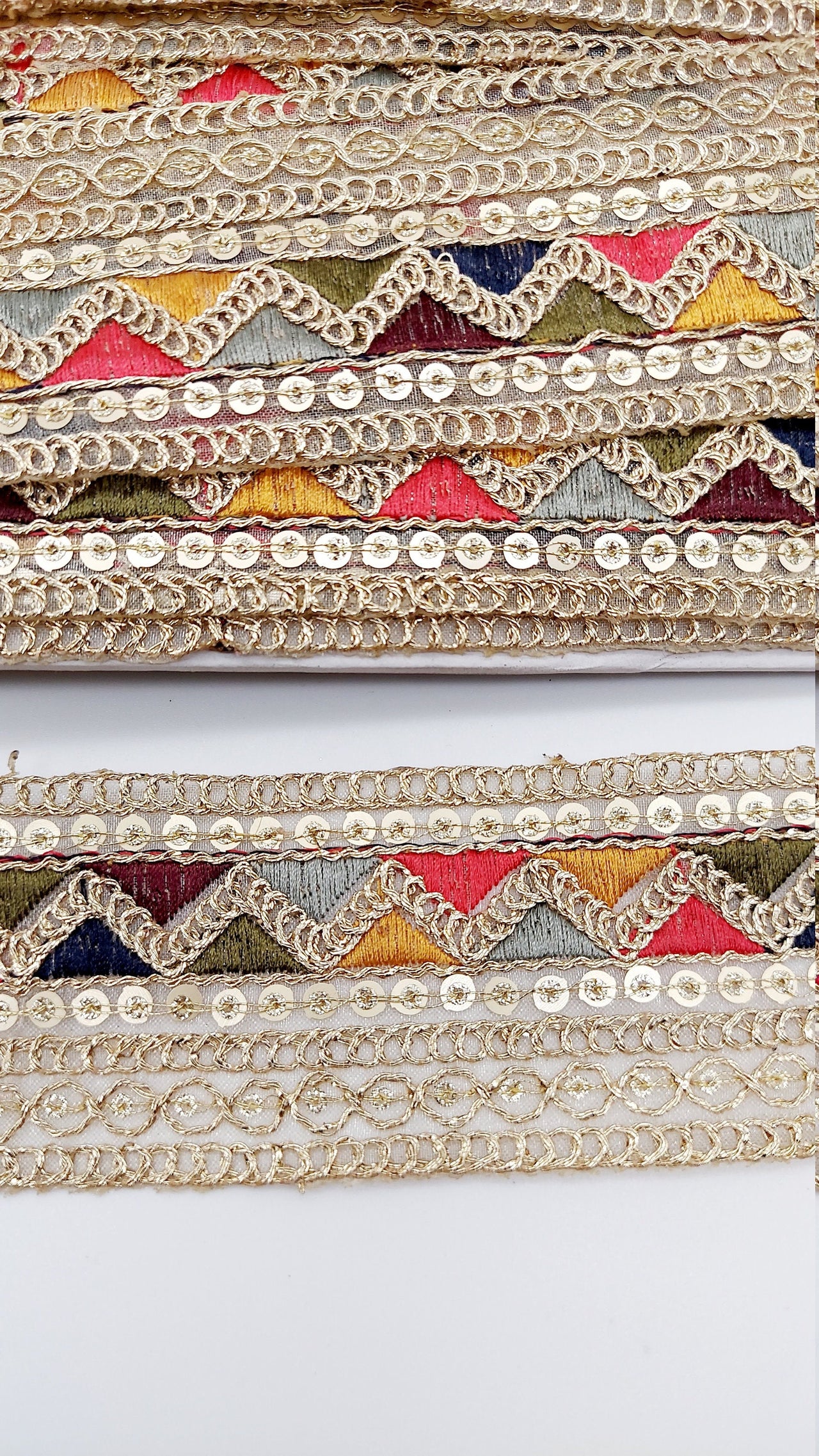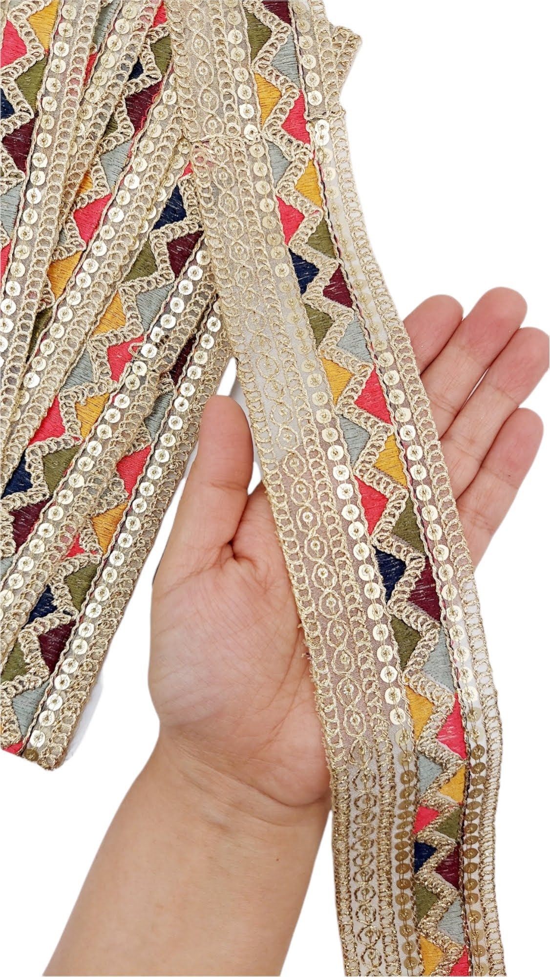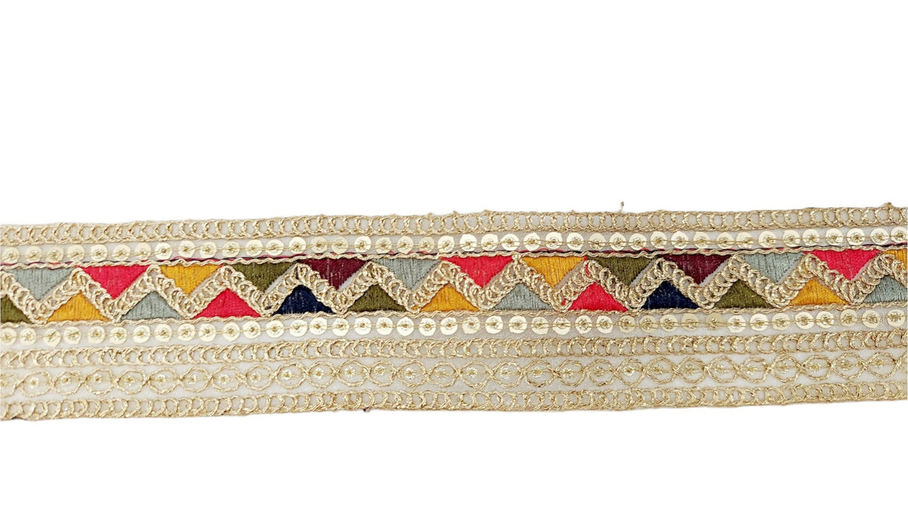 The embroidery on this trim is called Zardozi, an exclusive type of embroidery that is done by hand. Zardozi comes from two Persian words: zar or zarin meaning 'gold', and dozi meaning 'sewing'. Zardozi is a type of heavy and elaborate metal embroidery on a silk, satin, or velvet fabric base.