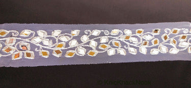 This listing is for a lovely White Net Fabric Lace Trim With Silver Embroidery And Mirror Embellishments. The embroidery work with mirrors on this trim is a speciality of Indian workmanship. This is a very unique fabric trim and a special KnicKnackNook find which you will not find anywhere else.