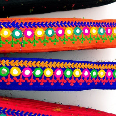 This listing is for a lovely Royal Blue Indian Mirror Trim Kutch Embroidered Navratri Garba Dress Trim Bridal Lace, Sari Border 35 mm Wide Trim Per 3 Yards. The embroidery work with mirrors on this trim is a speciality of Indian workmanship and is called as 'Abla Work' Or 'Shisha Work'. This is a very unique fabric trim and a special KnicKnackNook find which you will not find anywhere else.