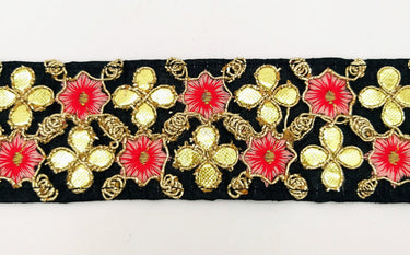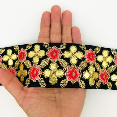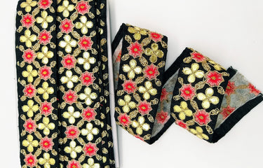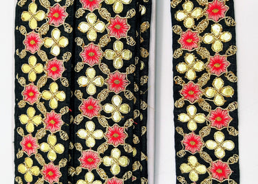 This listing is for a lovely Black Art Silk Fabric Trim, Salmon Pink & Gold Floral Embroidery Gota Patti Indian Sari Border Trim By Yard Decorative Trim Craft Lace. The embroidery work on this trim is a speciality of Indian embroidery and the work is called Gota Patti.