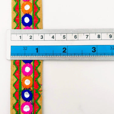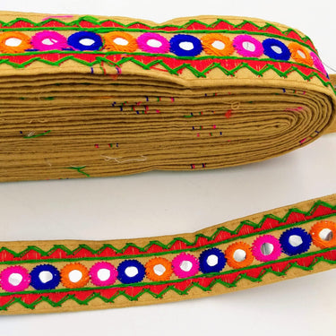 This listing is for a lovely Beige And Red Indian Mirror Trim Kutch Embroidered Navratri Garba Dress Trim Bridal Lace, Sari Border 30 mm Wide Trim Per 3 Yards. The embroidery work with mirrors on this trim is a speciality of Indian workmanship and is called as 'Abla Work' Or 'Shisha Work'. This is a very unique fabric trim and a special KnicKnackNook find which you will not find anywhere else.