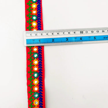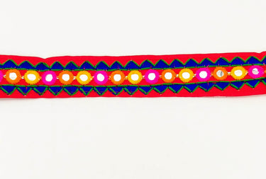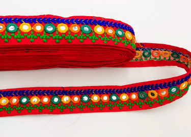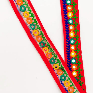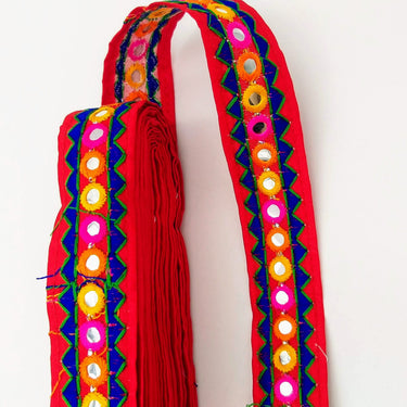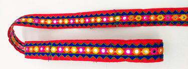 This listing is for a lovely Red Indian Mirror Trim Kutch Embroidered Navratri Garba Dress Trim Bridal Lace, Sari Border 35 mm Wide Trim Per 3 Yards. The embroidery work with mirrors on this trim is a speciality of Indian workmanship and is called as 'Abla Work' Or 'Shisha Work'. This is a very unique fabric trim and a special KnicKnackNook find which you will not find anywhere else.