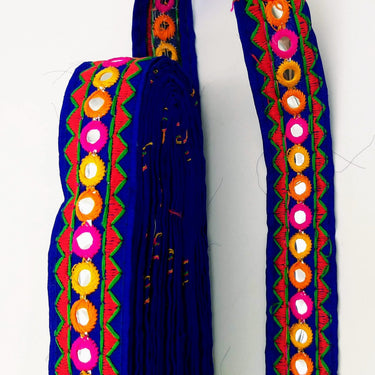 This listing is for a lovely Royal Blue And Red Indian Mirror Trim Kutch Embroidered Navratri Garba Dress Trim Bridal Lace, Sari Border 30 mm Wide Trim Per 3 Yards. The embroidery work with mirrors on this trim is a speciality of Indian workmanship and is called as 'Abla Work' Or 'Shisha Work'. This is a very unique fabric trim and a special KnicKnackNook find which you will not find anywhere else.