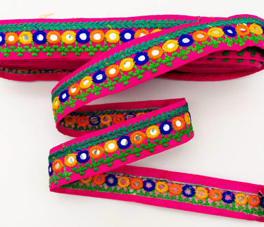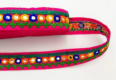 This listing is for a lovely Fuchsia Pink Indian Mirror Trim Kutch Embroidered Navratri Garba Dress Trim Bridal Lace, Sari Border 35 mm Wide Trim Per 3 Yards. The embroidery work with mirrors on this trim is a speciality of Indian workmanship and is called as 'Abla Work' Or 'Shisha Work'. This is a very unique fabric trim and a special KnicKnackNook find which you will not find anywhere else.