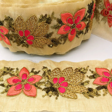 This listing is for a lovely Beige Silk Fabric Trim, Peach, Pink & Gold Floral Embroidery Indian Sari Border Trim By Yard Decorative Trim Craft Lace, Sequin Trim.
