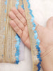 The embroidery on this trim is called Zardozi, an exclusive type of embroidery that is done by hand. Zardozi comes from two Persian words: zar or zarin meaning 'gold', and dozi meaning 'sewing'. Zardozi is a type of heavy and elaborate metal embroidery on a silk, satin, or velvet fabric base.